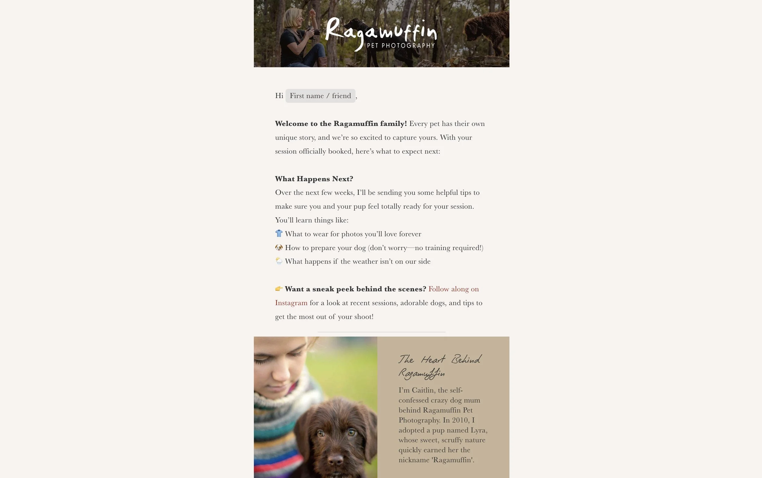 I used to do what most photographers do: send one big welcome email or attach a fancy PDF session guide. It was beautifully designed, filled with everything they needed to know. What to bring, what to wear, how to prep their dog, what to expect on the day, what happens if it rains... the works.